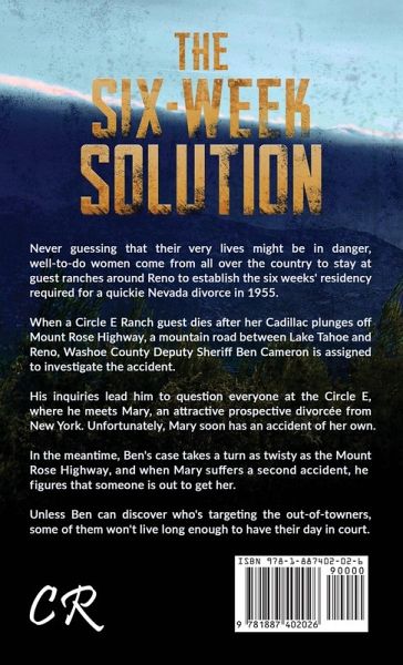 Never guessing that their very lives might be in danger, well-to-do women come from all over the country to stay at guest ranches around Reno to establish the six weeks' residency required for a quickie Nevada divorce in 1955. When a Circle E Ranch guest dies after her Cadillac plunges off Mount Rose Highway, a mountain road between Lake Tahoe and Reno, Washoe County Deputy Sheriff Ben Cameron is assigned to investigate the accident. His inquiries lead him to question everyone at the Circle E, where he meets Mary, an attractive prospective divorcée from New York. Unfortunately, Mary soon has an accident of her own. In the meantime, Ben's case takes a turn as twisty as the Mount Rose Highway, and when Mary suffers a second accident, he figures that someone is out to get her. Unless Ben can discover who's targeting the out-of-towners, some of them won't live long enough to have their day in court.