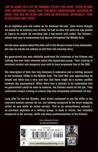 As an 18-year-old, John Urwin was posted to Cyprus, where he was recruited into a top-secret unit called the Sixteen, whose task was to assassinate key figures throughout the Middle East. Now he breaks his silence to tell their story. Their training was said to have surpassed that of the SAS in unarmed combat and weaponry. His description of their four key missions is explosive and a riveting account of the turbulent 1950s in the Middle East. The Cold War was approaching its height and when there was a mission to be undertaken that no government could be seen to endorse, the Sixteen would do the job. No previous depiction of a military group, in book or movie, has remotely compared to the secrecy, skills and sheer professionalism of the Sixteen.