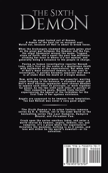 An angel locked out of Heaven. A demon on the hunt for an escaped soul. Watch out, because all Hell is about to break loose. When the Archangels slammed the pearly gates shut on the great war between the Demons and the Fae, the angel Shemasiel missed the memo. Trapped alone on Earth, she's spent the past few millennia sticking her nose in where it's not wanted, and generally being a nuisance to the people in charge. Posing as human investigative reporter Neveah Lane, she's first on the scene of a mysterious death with hallmarks of the supernatural. But when one of Hell's most notorious demons is also sent to investigate, it quickly becomes apparent that more is at stake than the death of a single woman. Now, with the truce between two powerful, warring races hanging in the balance, a stranded angel and Hell's most devious spymaster must choose whether to oppose each other on principle, or work together for peace. As the two orbit each other in pursuit of their competing goals, Neveah finds herself experiencing the appeal of the forbidden for the first time in her ageless existence. Angels are supposed to be immune from temptation. Too bad Neveah was never a very good angel. * * * The Sixth Demon is a new urban fantasy romance series by R. A. Steffan, set in the same world as the bestselling series The Last Vampire. Get the complete series omnibus today, and enter a world shared by humans, angels, demons, fae, and vampires. It's a place where the supernatural threatens the mundane, nothing is as it seems, and love will either be the world's downfall-or its salvation. Series arcs set in this world: The Last Vampire (six books) Vampire Bound (four books) Forsaken Fae (three books) The Sixth Demon (four books)