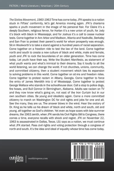 Time has come today. JFK speaks to a nation stuck in Fifties' conformity, let's get America moving again. JFK's charisma sparks a youth movement in the image of his personal flair. For Claire it's a deeply Southern, religious fervor, for Harlan it's a new union of youth, for Jody it's black with black in Mississippi, and for Joshua it's a call to cease nuclear tests. Come together in Ann Arbor and Madison, Atlanta and Nashville, Berkeley and San Fran to protest their parent's world for whom prosperity was enough. Sit-in Woolworth's to take a stand against a hundred years of racial separation. Come together on a freedom ride to test the law of the land. Come together north and south to create a new culture of black and white, male and female, youth and JFK to rock the boundaries of an older generation. Time has come today. Let youth have their say. Write the Student Manifesto, as statement of what youth wants and what's inimical to their dreams. Say it loudly to all the world listening, we can change the world. If not churches, unions, community, and committed citizenry, then a student movement which ties its expansion to solving problems in this world. Come together on sit-ins and freedom rides. Come together to protest racism in Albany, Georgia. Come together to force the entry of James Meridith into U of Mississippi. Come together to protest George Wallace who stands in the schoolhouse door. Call a stop to police dogs, fire hoses, and Bull Connor in Birmingham, Alabama. Adults see racism on TV and they now know what's going on, not east of the Iron Curtain but in our own southern cities. Be young and idealistic again. Come a more committed citizenry to march on Washington DC for civil rights and jobs for one and all. See the many, they are us. The answer blows in the wind. Hear the oratory of Dr. King as he tells us his dream of black and white, north and south, old and young, all together as God's children. Yet even as hope soars with late summer dreams, the