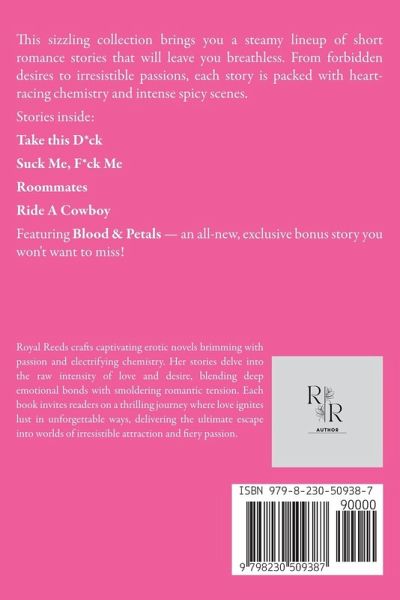 This sizzling collection brings you a steamy lineup of short romance stories that will leave you breathless. From forbidden desires to irresistible passions, each story is packed with heart-racing chemistry and intense spicy scenes. Stories inside: Take this D*ck Suck Me, F*ck Me Roommates Ride A Cowboy Featuring Blood & Petals - an all-new, exclusive bonus story you won't want to miss!