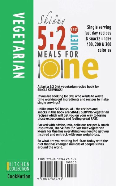 The Skinny 5:2 Fast Diet Vegetarian Meals For One Single Serving Fast Day Recipes & Snacks Under 100, 200 & 300 Calories At last a 5:2 Diet vegetarian recipe book for SINGLE SERVINGS! If you are cooking for ONE who wants to waste time working out ingredients and recipes to make single servings? Unlike most 5:2 books, ALL the recipes and snacks in this book are SINGLE SERVING recipes which will get you on your way to losing those extra pounds and feeling great FAST. Packed with: Over 100 delicious vegetarian recipe & snack inspiration ideas Intro, advice and info on the 5:2 Diet All recipes are MEALS FOR ONE The Skinny 5:2 Fast Diet Vegetarian Meals For One has everything you need to get you inspired and on track with your weight-loss. So what are you waiting for? Start today with the diet that has changed millions of people's lives around the world. Look out for our new men's 5:2 Diet title. MANFOOD: 5:2 Fast Diet Meals For Men: Simple & Delicious, Fuss Free, Fast Day Recipes For Men Under 200, 300, 400 & 500 Calories. www.cooknationbooks.com www.bellmackenzie.com