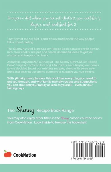 Imagine a diet where you can eat whatever you want for 5 days a week and fast for 2. That's what the 5:2 diet is and it's revolutionised the way people think about dieting. The Skinny 5:2 Diet Slow Cooker Recipe Book is packed with advice, info, slow cooker recipes and snack inspiration ideas to get you started and keep you on track. As bestselling Amazon authors of 'The Skinny Slow Cooker Recipe Book' range we noticed lots of 5:2 followers were buying our books, so we decided to put our existing recipes, along with some new ones, into easy to use menu planners to support your 5:2 efforts. With 36 daily meal planners this book has everything you need to get you through, and with family friendly recipes and suggestions you can still feed your family as well as yourself even on your fasting days. Slow cooker recipes include: Perfect Pulled Pork Sweet Asian Chicken Chili Con Carne Wild Mushroom Stroganoff (v) Italian Meatballs Budapest's Best Beef Goulash Enchilada El Salvador Sweet & Sour Pineapple Pork Sweet & Citrus Salmon Best Ever Chicken Curry Hand To Mouth Tex Mex Tacos (v) Tuna & Noodle Cattia Luscious Italian Chicken Lean Green Risotto (v) Green Thai Fish Curry Slow Spanish Tombet (v) Zingy Lime Chicken Shepherd-less Pie (v) Lovely Lemony Garlicky Chicken Slow Cooked Corn On The Cob (v) St Patrick's Day Soup (v) Corn & Potato Chowder (v) Super Simple Chicken Taco Soup Hock Ham & Split Pea Soup Asian Hot Soup (v) Zucchini Soup (v) Barley & Chestnut Mushroom Soup (v) Bean, Rosemary & Roasted Garlic Dip (v) Nacho, Bean & Onion Dip (v) Multigrain Breakfast (v) Morning Millet (v) Look out for our new men's 5:2 title: MANFOOD: 5:2 Fast Diet Meals For Men: Simple & Delicious, Fuss Free, Fast Day Recipes For Men Under 200, 300, 400 & 500 Calories. www.cooknationbooks.com www.bellmackenzie.com