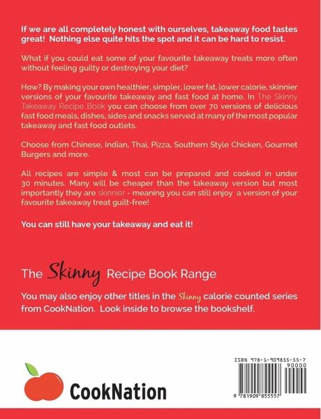 The Skinny Takeaway Recipe Book Healthier Versions Of Your Fast Food Favourites: Chinese, Indian, Pizza, Burgers, Southern Style Chicken, Mexican & More. All Under 300, 400 & 500 Calories. If we are all completely honest with ourselves, takeaway food tastes great! Nothing else quite hits the spot and it can be hard to resist. What if you could eat some of your favourite takeaway treats more often without feeling guilty or destroying your diet? How? By making your own healthier, simpler, lower fat, lower calorie, skinnier versions of your favourite takeaway and fast food at home. In The Skinny Takeaway Recipe Book you can choose from over 70 versions of delicious fast food meals, dishes, sides and snacks served at many of the most popular takeaway and fast food outlets. Choose from Chinese, Indian, Thai, Pizza, Southern Style Chicken, Gourmet Burgers, Kebabs and more. All recipes are simple & most can be prepared and cooked in under 30 minutes. Many will be cheaper than the takeaway version but most importantly they are skinnier - meaning you can still enjoy a version of your favourite takeaway treat guilt-free! You can still have your takeaway and eat it! You may also enjoy other titles from the Skinny calorie counted series. Just search ‘cooknation’ on Amazon.