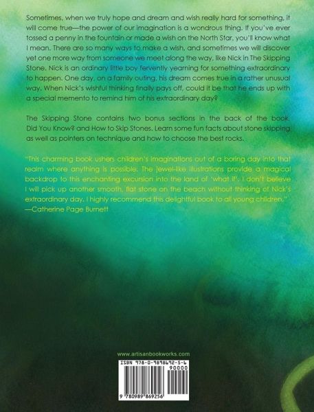 Sometimes, when we truly hope and dream and wish really hard for something, it will come true-the power of our imagination is a wondrous thing. If you've ever tossed a penny in the fountain or made a wish on the North Star, you know what I mean. There are so many ways to make a wish, and sometimes we will discover yet one more way from someone we meet along the way, like Nick in The Skipping Stone. Nick is an ordinary little boy fervently yearning for something extraordinary to happen. One day, on a family outing, his dream comes true in a rather unusual way. When Nick's wishful thinking finally pays off, could it be that he ends up with a special memento to remind him of his extraordinary day? A charming story beautifully brought to life with colorful illustrations, The Skipping Stone is just right for wee ones who love being read aloud to and for children just learning how to read, ages 0-7. This special edition of The Skipping Stone contains two bonus sections in the back of the book, Did You Know? and How to Skip Stones. Learn some fun facts about stone skipping as well as pointers on technique and how to choose the best rocks. Written by Kelly Lenihan and illustrated by Oona Risling-Sholl and Naomi Bardoff.