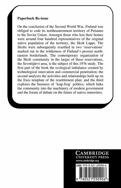 On the conclusion of the Second World War, Finland was obliged to cede its northeasternmost territory of Petsamo to the Soviet Union. Amongst those who lost their homes were around four hundred representatives of the original native population of the territory, the Skolt Lapps. The Skolts were subsequently resettled in two 'reservations' marked out in the wilderness of Finland's present northeastern borderlands. The contemporary organization of the Skolt community in the larger of these reservations, the Sevettijärvi area, is the subject of this 1976 study. The first part of the book the ecological imbalance created by technological innovation and commercial penetration; the second analyses the the activities and relationships built up on the fixes template of the resettlement plan; and the third explores the business of 'leap-frog' politics, which links the community into the machinery of modern government and the forum of debate on the future of native minorities.