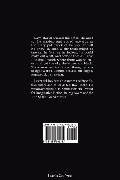 Dave stared around the office. He went to the window and stared upwards at the crazy patchwork of the sky. For all he knew, in such a sky there might be cracks. In fact, as he looked, he could make out a rift, and beyond that a ... hole ... a small patch where there was no color, and yet the sky there was not black. There were no stars there, though points of light were clustered around the edges, apparently retreating. Lester del Rey was an American science fiction author and editor at Del Rey Books. He was awarded the E. E. Smith Memorial Award for Imaginative Fiction, Balrog Award and the 11th SFWA Grand Master.