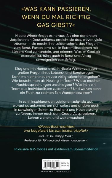 Schon als Kind begeistert sich Nicola Winter für das Fliegen - doch für eine Ausbildung als Pilotin bei der Lufthansa ist sie zu klein. Als sie von der Kampffliegerausbildung der Bundeswehr erfährt, weiß sie daher sofort: Das ist es. Mutig setzt sie sich in den Aufnahmetests durch und schafft das, wovon Viele träumen - sie macht ihre Leidenschaft zum Beruf. In den schnellsten Jets der Welt lernt Nicola Winter, mit Höhenflügen, Absturzgefahr und Extrembedingungen umzugehen und was es bedeutet, in brenzligen Situationen voranzugehen. Als sie 2022 in die Astronauten-Reserve der European Space Agency aufgenommen wird, steht sie vor einer persönlichen Herausforderung, die zeigt, wie hochrelevant ihre Erfahrungen als Pilotin auch auf festem Boden sind. Lebensklug und voller Inspiration erzählt Nicola Winter von ihren Erlebnissen am Rande des Machbaren und zeigt auf, welche Führungsqualitäten und Stärken wichtig sind, um in krisenreichen Zeiten sich selbst und andere zu Resilienz und Hochleistungen zu führen.