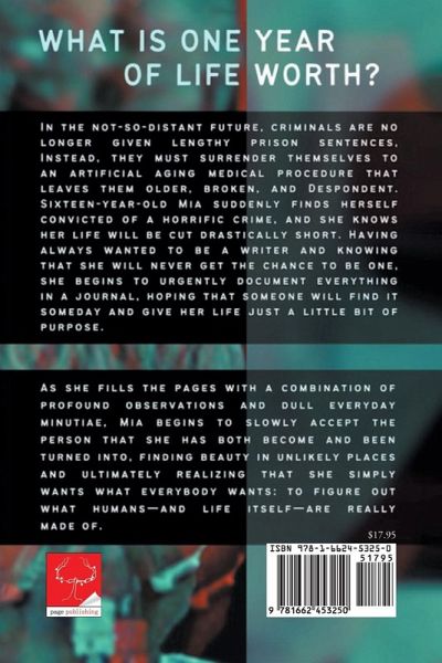 What is one year of human life worth? In the not-so-distant future, criminals are no longer given lengthy prison sentences. Instead, they must surrender years of their lives by subjecting themselves to an artificial aging medical procedure that leaves them older, broken, and despondent. Sixteen-year-old Mia suddenly finds herself convicted of a horrific crime, and she knows that her life will be cut drastically short. Having always wanted to be a writer and knowing that she will never get the chance to be one, she begins to urgently document everything in a journal, hoping that someone will find it someday and give her life just a little bit of purpose. As she fills the pages with a combination of profound observations and dull everyday minutiae, Mia begins to slowly accept the person that she has both become and been turned into, finding beauty in unlikely places and ultimately realizing that she simply wants what everybody wants: to figure out what humans-and life itself-are really made of.