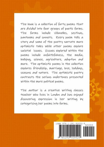 The book is a collection of forty poems that are divided into four groups of poetic forms. The forms include villanelles, sestinas, pantoums and sonnets. Every poem tells a story and some of the poetry narrate more optimistic tales while other poems explore societal issues. Issues explored within the poems include unfaithfulness, the media, bullying, science, agriculture, adoption and more. The optimistic poems in the collection explores friendship, marriage, love, holidays, seasons and nature. The optimistic poetry contrasts the serious undertones presented within the more political poems. The author is a creative writing classes teacher who lives in London and has enjoyed discovering expression in her writing by categorising her poems into forms.