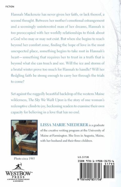 Hannah Mackenzie has never given her faith, or lack thereof, a second thought. Between her mother's emotional estrangement and a seemingly uninterested man of her dreams, Hannah is too preoccupied with her worldly relationships to think about a God who may or may not exist. But when she begins to reach beyond her comfort zone, finding the hope of love in the most unexpected place, something begins to take root in Hannah's heart-something that requires her to trust in a truth that is beyond what she can touch and see. Will the ice and storms of a brutal winter prove too much for Hannah to handle? Will her fledgling faith be strong enough to carry her through the trials to come? Set against the ruggedly beautiful backdrop of the western Maine wilderness, The Sky We Walk Upon is the story of one woman's redemptive climb to joy, beckoning readers to examine their own capacity for believing in a love that has no end.