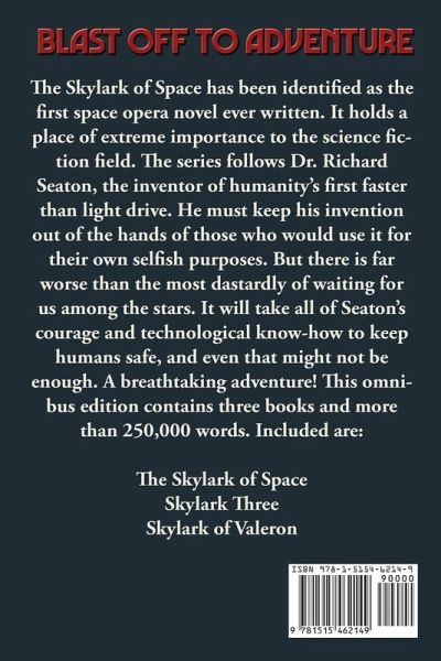 The Skylark of Space has been identified as the first space opera novel ever written. It holds a place of extreme importance to the science fiction field. The series follows Dr. Richard Seaton, the inventor of humanity's first faster than light drive. He must keep his invention out of the hands of those who would use it for their own selfish purposes. But there is far worse than the most dastardly of waiting for us among the stars. It will take all of Seaton's courage and technological know-how to keep humans safe, and even that might not be enough. A breathtaking adventure! This omnibus edition contains three books and more than 250,000 words. Included are: The Skylark of SpaceSkylark ThreeSkylark of Valeron