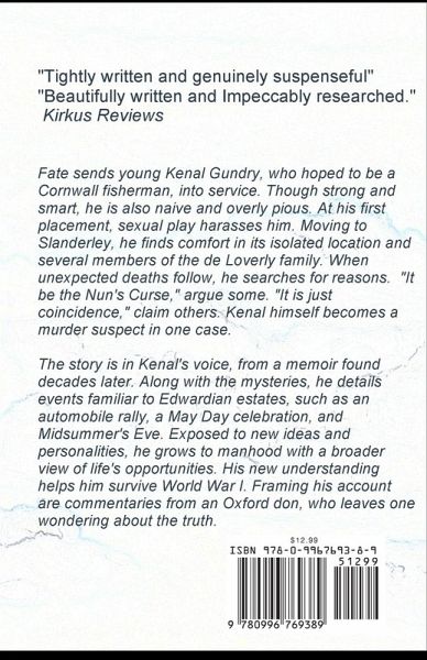 "Beautifully written and impeccably researched,.... the story is certain to captivate fans of both manor fiction and cozy murder mysteries, many of whom will not foresee the villainy that Stasz unveils." Kirkus Reviews Fate sends young Kenal Gundry, who hoped to be a Cornwall fisherman, into service. Though strong and smart, he is also naive and overly pious. At his first placement, a nymphomaniac harasses him. Moving to Slanderley, he finds comfort in its isolated location and several members of the de Loverly family. When unexpected deaths follow, he searches for reasons. "It be the Nun's Curse," argue some. "It is just coincidence," claim others. Kenal himself becomes a murder suspect in one case. The story is in Kenal's voice, from a memoir found decades later. Along with the mysteries, he details events familiar to Edwardian estates, such as an automobile rally, a May Day celebration, and Midsummer's Eve. He meets working artists, a Hungarian wine merchant, and an Oxford archivist. Exposed to new ideas and personalities, he grows to manhood with a broader view of life's opportunities. His new understanding helps him survive World War I, though not as a combatant. Framing his account are commentaries from an Oxford don, who leaves one wondering about the truth.