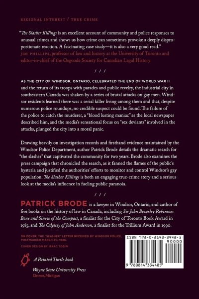 As the city of Windsor, Ontario, celebrated the end of World War II and the return of its troops with parades and public revelry, the industrial city in the south of Canada was shaken by a series of brutal stabbings. The failure of the police to catch the murderer, a "blood lusting maniac" as the local newspaper described him, the turbulence of the times, and the seemingly random nature of the killings plunged the city into a panic. In The Slasher Killings Patrick Brode tells the dramatic story of the Windsor slasher, the social frenzy that his attacks created, and the surprising results that this hysteria generated. By July and August of 1945, Windsor residents knew there was a serial killer living among them and that, despite numerous police roundups, no credible suspect had been found. The following summer the panic escalated when the stabbings began again and, this time, focused on "sex deviants" whom the public and police had decided were at the heart of the problem. Brode examines the vicious press campaign that arose out of the paranoia that vilified drifters, the unemployed, racial minorities, and, finally, sexual outsiders, only further fanning the flames of the growing panic. Brode reveals how the authorities used this hysteria to support their efforts to monitor and control the actions of gay men, a campaign that would be part of the process that led to Canada's 1948 "criminal sexual psychopath" law but would ultimately bring them no closer to the identity of the killer. The Slasher Killings draws heavily on the records of the murder investigations maintained by the Windsor Police Department, bringing firsthand evidence and documents to light in this dramatic mystery and informative historical study. Local history buffs, true-crime enthusiasts, and readers interested in the role of the media in shaping public discourse will appreciate The Slasher Killings.