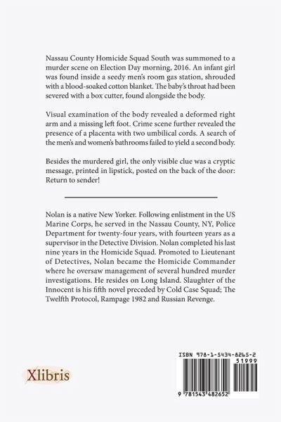 Nassau County Homicide Squad South was summoned to a murder scene on Election Day morning, 2016. An infant girl was found inside a seedy mens room gas station, shrouded with a blood-soaked cotton blanket. The babys throat had been severed with a box cutter, found alongside the body. Visual examination of the body revealed a deformed right arm and a missing right foot. Crime scene further revealed the presence of a placenta with two umbilical cords. A search of the mens and womens bathrooms failed to yield a second body. Besides the murdered girl, the only visible clue was a cryptic message, printed in lipstick, posted on the back of the door: Return to sender!