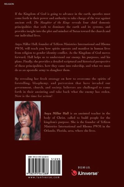 If the Kingdom of God is going to advance in the earth, apostles must come forth in their power and authority to take charge of the war against ancient evil. The Slaughter of the Kings reveals four chief demonic principalities that seek to dominate the earth and its systems, and provides insight into the plot and mindset of Satan toward the church and our individual lives. Anya Miller Hall, founder of TeKton Ministries International and Rhema PWM, will teach you how spirits operate and manifest in human lives from religion to gender identity conflict. As the Kingdom of God moves forward, Hall helps us to understand our enemy, his purposes, and his plans. Finally, she provides a detailed scriptural and historical perspective of these principalities, how they came into rulership, and what we must do as an apostolic army to slaughter them. By revealing her fresh strategy on how to overcome the spirits of foretelling, blasphemy, and perversion that have invaded our government, church, and society, believers are challenged to come forth in their anointing and take back what the enemy has stolen. Now is the time for action!