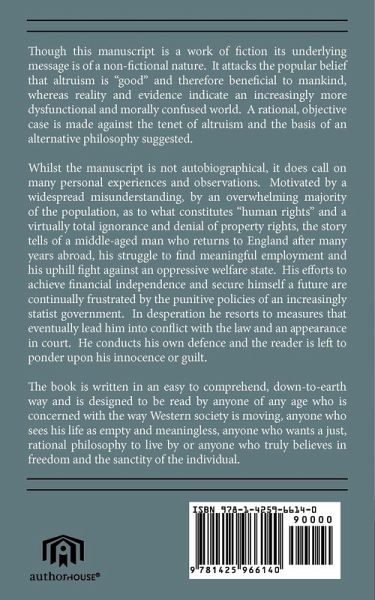 Though this manuscript is a work of fiction its underlying message is of a non-fictional nature. It attacks the popular belief that altruism is "good" and therefore beneficial to mankind, whereas reality and evidence indicate an increasingly more dysfunctional and morally confused world. A rational, objective case is made against the tenet of altruism and the basis of an alternative philosophy suggested. Whilst the manuscript is not autobiographical, it does call on many personal experiences and observations. Motivated by a widespread misunderstanding, by an overwhelming majority of the population, as to what constitutes "human rights" and a virtually total ignorance and denial of property rights, the story tells of a middle-aged man who returns to England after many years abroad, his struggle to find meaningful employment and his uphill fight against an oppressive welfare state. His efforts to achieve financial independence and secure himself a future are continually frustrated by the punitive policies of an increasingly statist government. In desperation he resorts to measures that eventually lead him into conflict with the law and an appearance in court. He conducts his own defence and the reader is left to ponder upon his innocence or guilt. The book is written in an easy to comprehend, down-to-earth way and is designed to be read by anyone of any age who is concerned with the way Western society is moving, anyone who sees his life as empty and meaningless, anyone who wants a just, rational philosophy to live by or anyone who truly believes in freedom and the sanctity of the individual.