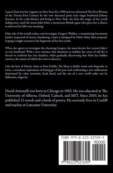 Laura Chain lost her virginity on New Years Eve 1999 and was christened The First Woman of the Twenty-First Century by her now deceased punk rock singer boyfriend Johnny Enzyme. In her early-thirties and living in New York, she feels the magic of her youth fading away, until she meets John Halo, a mysterious British agent who gives her a chance to discover her life's true meaning. The story begins when Halo asks if she would use her seductive skills to help investigate Gregory Walden, a womanizing investment banker suspected of money laundering. Laura is intrigued by Halo's proposal, hoping it might reconnect the fragments of her lost youth and create parallels with Marlene Dietrich in Dishonored and Ingrid Bergman in Notorious, activities worthy of The First Woman of the Twenty-First Century. When she agrees to investigate the charming Gregory she must deceive her current boyfriend, biker/ex-con Jonathan Mace. With a romance that threatens to redefine her sense of self she is forced to confront her true loyalties, while discovering that Halo has hidden motives, the nature of which she vows to discover. Stylistically comparable to Martin Amis' London Fields and Don DeLillo's Cosmopolis, The Sleep is darkly comic and rhapsodic in turns, a trenchant exploration of letting go of the past and confronting a new millennium dominated by cyber terrorism, bank fraud, and the rise of a new world order run by billionaire oligarchs.