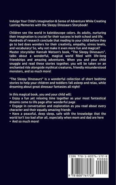Indulge Your Child's Imagination & Sense of Adventure While Creating Lasting Memories with the Sleepy Dinosaurs Storybook! Children see the world in kaleidoscope colors. As adults, nurturing their imagination is crucial for their success in both school and life. Hundreds of research conclude that reading to your child before they go to bed does wonders for their creativity, empathy, stress levels, and vocabulary! So, why not make it even more fun and magical? Master storyteller Hannah Watson's book, "The Sleepy Dinosaurs", talks about a wonderful, magical world filled with life-long friendships and amazing adventures. When you and your child snuggle and read these stories together, you will be taken on an enchanted ride alongside mythical creatures, friendly misunderstood monsters, and so much more! "The Sleepy Dinosaurs" is a wonderful collection of short bedtime stories to help your children and toddlers fall asleep and relax, while dreaming about great dinosaur fantasies all night! In this magical book, you and your child will:Enjoy a fun yet relaxing time together as your most fantastical dreams come to life page after wonderful page Engage in conversation and exploration as you read about every character and their equally amazing friends Have a peaceful, deep sleep, safe with the knowledge that the world isn't too bad after all, especially when mom and dad are here And so much more! Reading bed time stories to your child every night is one of the many joys in a parent's life. Not only will you be creating wonderful memories to look back on in the future, but you will also be cultivating your child's sense of wonder and discovery, as well as their vocabulary! So make it more colorful and enjoyable with "The Sleepy Dinosaurs"!