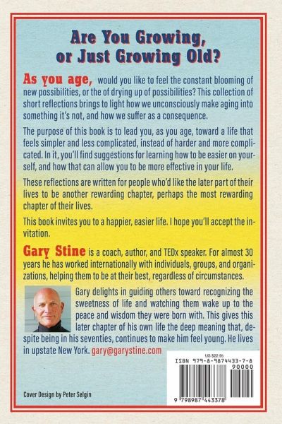 Are you growing, or just growing old? As you age, would you like to feel the constant blooming of new possibilities, or the of drying up of possibilities? This collection of short reflections brings to light how we unconsciously make aging into something it's not, and how we suffer as a consequence. The purpose of this book is to lead you, as you age, toward a life that feels simpler and less complicated, instead of harder and more complicated. In it, you'll find suggestions for learning how to be easier on yourself, and how that can allow you to be more effective in your life. These reflections are written for people who'd like the later part of their lives to be another rewarding chapter, perhaps the most rewarding chapter of their lives. This book invites you to a happier, easier life. I hope you'll accept the invitation.