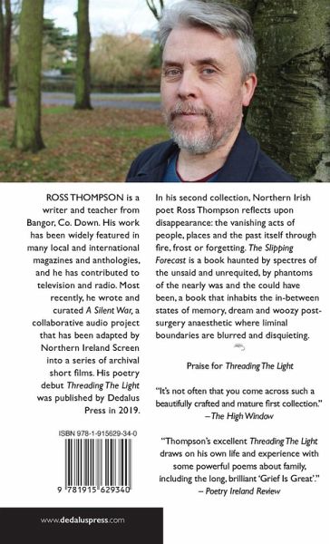 In his second collection, Northern Irish poet Ross Thompson reflects upon disappearance: the vanishing acts of people, places and the past itself through fire, frost or forgetting. The Slipping Forecast is a book haunted by spectres of the unsaid and unrequited, by phantoms of the nearly was and the could have been, a book that inhabits the in-between states of memory, dream and woozy post-surgery anaesthetic where liminal boundaries are blurred and disquieting. Praise for Threading The Light: "It's not often that you come across such a beautifully crafted and mature first collection." - The High Window "Thompson's excellent Threading The Light draws on his own life and experience with some powerful poems about family, including the long, brilliant 'Grief Is Great'." - Poetry Ireland Review
