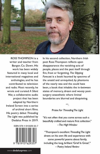 In his second collection, Northern Irish poet Ross Thompson reflects upon disappearance: the vanishing acts of people, places and the past itself through fire, frost or forgetting. The Slipping Forecast is a book haunted by spectres of the unsaid and unrequited, by phantoms of the nearly was and the could have been, a book that inhabits the in-between states of memory, dream and woozy post-surgery anaesthetic where liminal boundaries are blurred and disquieting. Praise for Threading The Light: "It's not often that you come across such a beautifully crafted and mature first collection." - The High Window "Thompson's excellent Threading The Light draws on his own life and experience with some powerful poems about family, including the long, brilliant 'Grief Is Great'." - Poetry Ireland Review