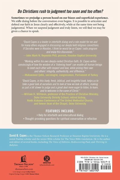 God invites us to judge and to help correct wrongs from a place of understanding. Sometimes we pre-judge a person based on our own biases and superficial experiences. We stifle dialog before the conversation even begins. If all we know is our own faith, and we never put it side-by-side with what others believe, our spiritual growth and commitments can be easily stunted. By truly listening and learning from those with different beliefs, we can broaden and deepen our kingdom commitments. It is possible to stand up for Jesus, to articulate our faith clearly as witnesses, and to defend our faith effectively, while at the same time not being perceived as judgmental. Christians need to be faithful witnesses to God who are willing to listen to people with drastically different stories. In those exchanges, when we suspend judgment and truly listen, we will find truth and beauty and goodness in some of the most unexpected places. We will also find that, if we truly listen, we may be given a chance to speak. Features include: Help for interfaith and intercultural dialog Thought-provoking questions for spiritual conversation or reflection