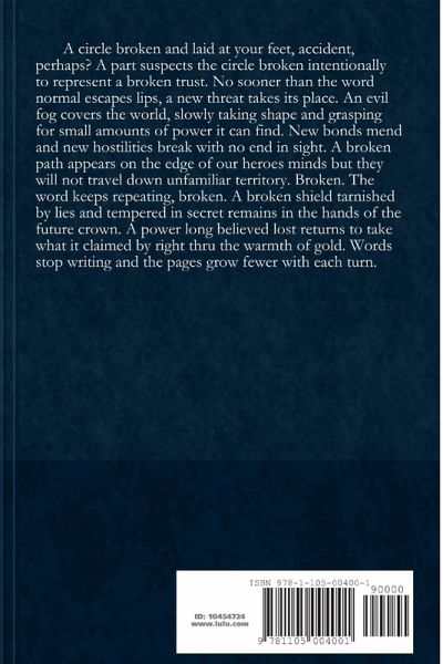 A circle broken and laid at your feet, accident, perhaps? A part suspects the circle broken intentionally to represent a broken trust. No sooner than the word normal escapes lips, a new threat takes its place. An evil fog covers the world, slowly taking shape and grasping for small amounts of power it can find. New bonds mend and new hostilities break with no end in sight. A broken path appears on the edge of our heroes minds but they will not travel down unfamiliar territory. Broken. The word keeps repeating, broken. A broken shield tarnished by lies and tempered in secret remains in the hands of the future crown. A power long believed lost returns to take what it claimed by right thru the warmth of gold. Words stop writing and the pages grow fewer with each turn.