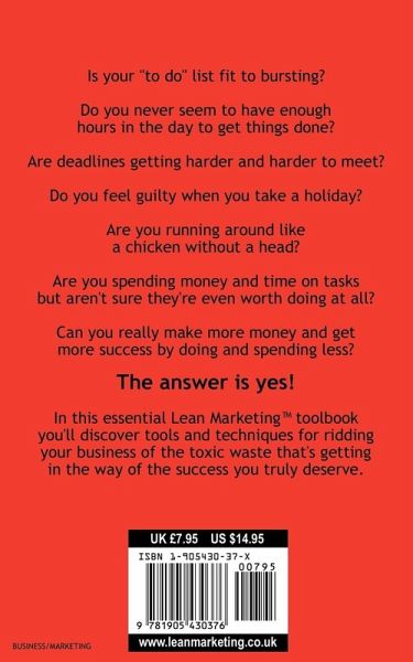 Is your "to do" list fit to bursting? Do you never seem to have enough hours in the day to get things done? Are deadlines getting harder and harder to meet? Do you feel guilty when you take a holiday? Are you running around like a chicken without a head? Are you spending money and time on tasks but aren't sure they're even worth doing at all? Can you really make more money and get more success by doing and spending less? The answer is yes! In this essential Lean Marketing toolbook you'll discover tools and techniques for ridding your business of the toxic waste that's getting in the way of the success you truly deserve.