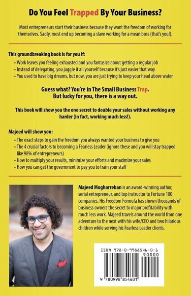 Do You Feel Trapped By Your Business? Most entrepreneurs start their business because they want the freedom of working for themselves. Sadly, most end up becoming a slave working for a mean boss (that’s you!). This groundbreaking book is for you if: * Work leaves you feeling exhausted and you fantasize about getting a regular job * Instead of delegating, you juggle it all yourself because it’s just easier that way * You used to have big dreams, but now, you are just trying to keep your head above water Guess what? You’re in The Small Business Trap. But lucky for you, there is a way out. This book will show you the one secret to double your sales without working any harder (in fact, working much less!). Majeed will show you: * The exact steps to gain the freedom you always wanted your business to give you * The 4 crucial factors to becoming a Fearless Leader (ignore these and you will stay trapped like 98% of entrepreneurs) * How to multiply your results, minimize your efforts and maximize your sales * How you can get the government to pay you to train your staff Majeed Mogharreban is an award-winning author, serial entrepreneur, and top instructor to Fortune 100 companies. His Freedom Formula has shown thousands of business owners the secret to major profitability with much less work. Majeed travels around the world from one adventure to the next with his wife/CEO and two hilarious children while serving his Fearless Leader clients