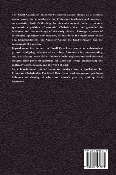 The Small Catechism authored by Martin Luther stands as a seminal work, laying the groundwork for Protestant teachings and succinctly encapsulating Luther's theology. In this enduring text, Luther presents a systematic exposition of essential Christian doctrine, grounded in Scripture and the teachings of the early church. Through a series of catechetical questions and answers, he elucidates the significance of the Ten Commandments, the Apostles' Creed, the Lord's Prayer, and the sacraments of Baptism.Beyond mere instruction, the Small Catechism serves as a theological primer, equipping believers with a robust framework for understanding and articulating their faith. Luther's lucid explanations and pastoral insights offer practical guidance for Christian living, emphasizing the centrality of grace, faith, and the Word of God.As a foundational text of Lutheran theology and a touchstone for Protestant Christianity, The Small Catechism continues to exert profound influence on theological education, church practice, and spiritual formation.