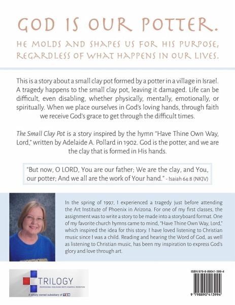 God is our potter. He molds and shapes us for His purpose, regardless of what happens in our lives. This is a story about a small clay pot formed by a potter in a village in Israel. A tragedy happens to the small clay pot, leaving it damaged. Life can be difficult, even disabling, whether physically, mentally, emotionally, or spiritually. When we place ourselves in God's loving hands, through faith we receive God's grace to get through the difficult times. The Small Clay Pot is a story inspired by the hymn "Have Thine Own Way, Lord," written by Adelaide A. Pollard in 1902. God is the potter, and we are the clay that is formed in His hands. "But now, O LORD, You are our father; We are the clay, and You, our potter; And we all are the work of Your hand." - Isaiah 64:8 (NKJV)