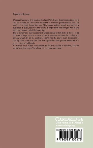 The Small Years was first published in June 1930 and printed three times in its first six months. In 1937 it was re-issued in a smaller pocket edition, and this went out of print during the war. This second edition, which was originally published in 1950, returned the text to its larger form. This is simply one man's account of what it meant to him to be a child - to be born and brought up at an unusual school in a remote and beautiful rurality; an account which, by all the evidence, clearly has power over its readers of inciting them to recover and live over again their own private memories of a great variety of childhoods. Mr Walter de la Mare's introduction to the first edition is retained, and the author's original map of the village is in its place once more.