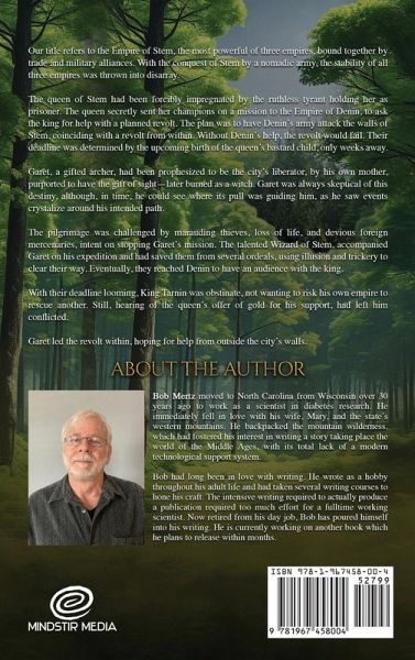 Our title refersOur title refers to the Empire of Stem, the most powerful of three empires, bound together by trade and military alliances. With the conquest of Stem by a nomadic army, the stability of all three empires was thrown into disarray. The queen of Stem had been forcibly impregnated by the ruthless tyrant holding her as prisoner. The queen secretly sent her champions on a mission to the Empire of Denin, to ask the king for help with a planned revolt. The plan was to have Denin's army attack the walls of Stem, coinciding with a revolt from within. Without Denin's help, the revolt would fail. Their deadline was determined by the upcoming birth of the queen's bastard child, only weeks away. Garet, a gifted archer, had been prophesized to be the city's liberator, by his own mother, purported to have the gift of sight-later burned as a witch. Garet was always skeptical of this destiny, although, in time, he could see where its pull was guiding him, as he saw events crystalize around his intended path. The pilgrimage was challenged by marauding thieves, loss of life, and devious foreign mercenaries, intent on stopping Garet's mission. The talented Wizard of Stem, accompanied Garet on his expedition and had saved them from several ordeals, using illusion and trickery to clear their way. Eventually, they reached Denin to have an audience with the king. With their deadline looming, King Tarnin was obstinate, not wanting to risk his own empire to rescue another. Still, hearing of the queen's offer of gold for his support, had left him conflicted. Garet led the revolt within, hoping for help from outside the city's walls.