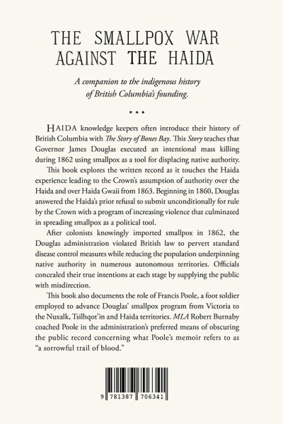 Haida knowledge keepers often introduce their history of British Columbia with "The Story of Bones Bay." This "Story" teaches that Governor James Douglas executed an intentional mass killing during 1862 using smallpox as a tool for displacing native authority. This book explores the written record as it touches the Haida experience leading to the Crown's assumption of authority over the Haida and over Haida Gwaii from 1863. Beginning in 1860, Douglas answered the Haida's prior refusal to submit unconditionally for rule by the Crown with a program of increasing violence that culminated in spreading smallpox as a political tool. After colonists knowingly imported smallpox in 1862, the Douglas administration violated British law to pervert standard disease control measures while reducing the population underpinning native authority in numerous autonomous territories. Officials concealed their true intentions at each stage by supplying the public with misdirection. This book also documents the role of Francis Poole, a foot soldier employed to advance Douglas' smallpox program from Victoria to the Nuxalk, Tsilhqot'in and Haida territories. MLA Robert Burnaby coached Poole in the administration's preferred means of obscuring the public record concerning what Poole's memoir refers to as "a sorrowful trail of blood."