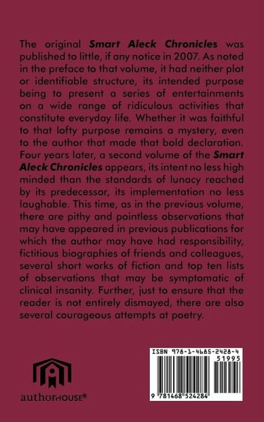 The original Smart Aleck Chronicles was published to little, if any notice in 2007. As noted in the preface to that volume, it had neither plot or identifiable structure, its intended purpose being to present a series of entertainments on a wide range of ridiculous activities that constitute everyday life. Whether it was faithful to that lofty purpose remains a mystery, even to the author that made that bold declaration. Four years later, a second volume of the Smart Aleck Chronicles appears, its intent no less high minded than the standards of lunacy reached by its predecessor, its implementation no less laughable. This time, as in the previous volume, there are pithy and pointless observations that may have appeared in previous publications for which the author may have had responsibility, fictitious biographies of friends and colleagues, several short works of fiction and top ten lists of observations that may be symptomatic of clinical insanity. Further, just to ensure that the reader is not entirely dismayed, there are also several courageous attempts at poetry.