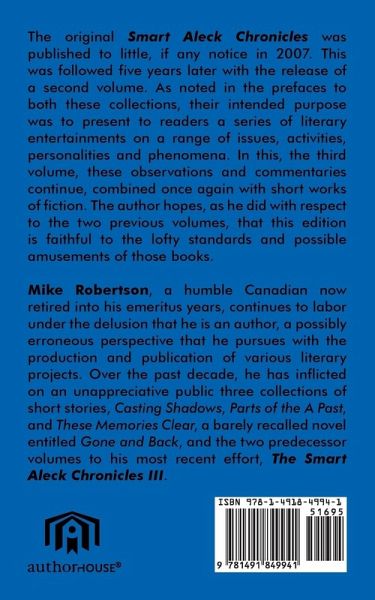 The original Smart Aleck Chronicles was published to little, if any notice in 2007. This was followed five years later with the release of a second volume. As noted in the prefaces to both these collections, their intended purpose was to present to readers a series of literary entertainments on a range of issues, activities, personalities and phenomena. In this, the third volume, these observations and commentaries continue, combined once again with short works of fiction. The author hopes, as he did with respect to the two previous volumes, that this edition is faithful to the lofty standards and possible amusements of those books.