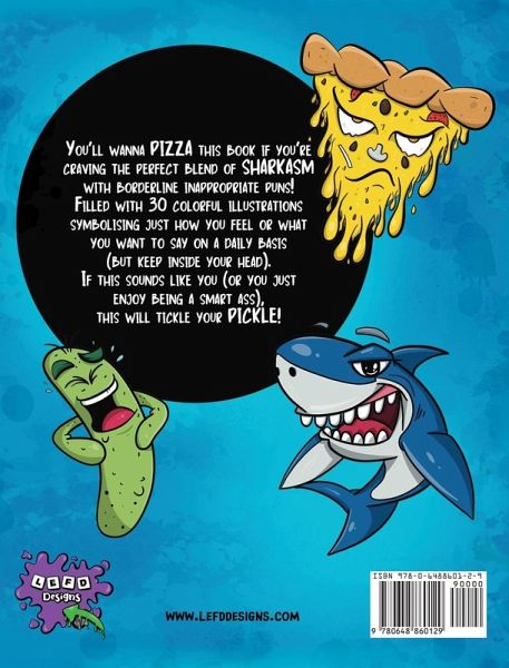 The Smart Ass Book of Puns - Guaranteed to hit you punny bone If you're looking for a punny book filled with vibrant, hilariously sarcastic puns, then this book is perfect for you! The Smart Ass Book of Puns will be sure to hit your punny bone and is the perfect gift for any pun-lover! You'll wanna pizza this book if you're craving the perfect blend of sharkasm with borderline inappropriate puns! Filled with 30 colorful illustrations symbolizing just how you feel or what you want to say on a daily basis (but keep in your head). If this sounds like you (or you just enjoy being a smart ass), this will tickle your pickle! Features:30 pages of vibrant, hilariously sarcastic puns. Available in paperback and hardcover (8 x 10 in). Also available - The Punny Book Collection:'Purrfectly Sweet Puns for Tweethearts'. 'The Naughty and Nice Book of Christmas Puns' The Punny Coloring Book Collection:'Sweet Puns Coloring Book'. 'Smart Ass Puns Coloring Book'. 'Christmas Puns Coloring Book' For more information, see www.lefddesigns.com