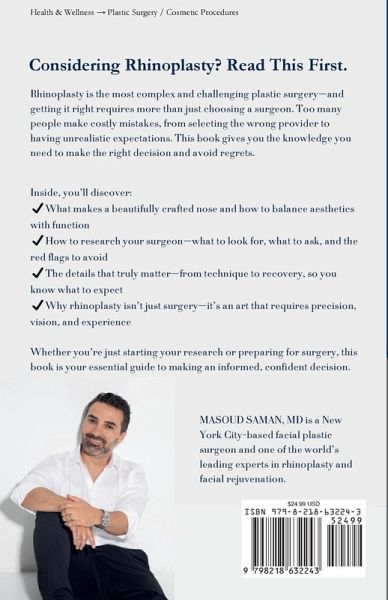 Considering a Nose Job? Read This First. Rhinoplasty is one of the most intricate cosmetic surgeries, and making the right decision requires more than just selecting a surgeon. Too often, patients rush into surgery without fully understanding what makes a nose both beautiful and functional. A misstep in the process can lead to regret, unnecessary revisions, or disappointing results. In The Smart Guide to Rhinoplasty, double board-certified facial plastic surgeon Dr. Masoud Saman offers an essential roadmap for anyone considering a nose job. This book breaks down the key elements of…mehr