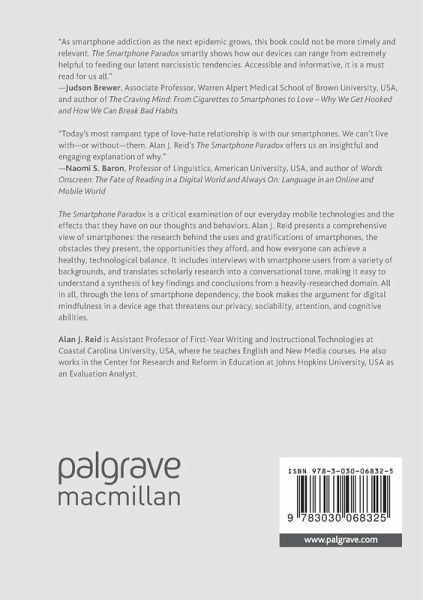 The Smartphone Paradox is a critical examination of our everyday mobile technologies and the effects that they have on our thoughts and behaviors. Alan J. Reid presents a comprehensive view of smartphones: the research behind the uses and gratifications of smartphones, the obstacles they present, the opportunities they afford, and how everyone can achieve a healthy, technological balance. It includes interviews with smartphone users from a variety of backgrounds, and translates scholarly research into a conversational tone, making it easy to understand a synthesis of key findings and conclusions from a heavily-researched domain. All in all, through the lens of smartphone dependency, the book makes the argument for digital mindfulness in a device age that threatens our privacy, sociability, attention, and cognitive abilities.