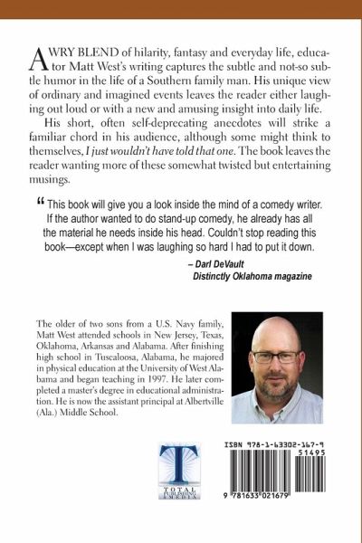 A wry blend of hilarity, fantasy and everyday life, educator Matt West’s writing captures the subtle and not-so subtle humor in the life of a Southern family man. His unique view of ordinary and imagined events leaves the reader either laughing out loud or with a new and amusing insight into daily life. His short, often self-deprecating anecdotes will strike a familiar chord in his audience, although some might think to themselves, I just wouldn’t have told that one. The book leaves the reader wanting more of these somewhat twisted but entertaining musings. 'This book will give you a look inside the mind of a comedy writer. If the author wanted to do stand-up comedy, he already has all the material he needs inside his head. Couldn’t stop reading this book—except when I was laughing so hard I had to put it down. – Darl DeVault Distinctly Oklahoma magazine The older of two sons from a U.S. Navy family, Matt West attended schools in New Jersey, Texas, Oklahoma, Arkansas and Alabama. After finishing high school in Tuscaloosa, Alabama, he majored in physical education at the University of West Alabama and began teaching in 1997. He later completed a master’s degree in educational administration.He is now the assistant principal at Albertville (Ala.) Middle School.
