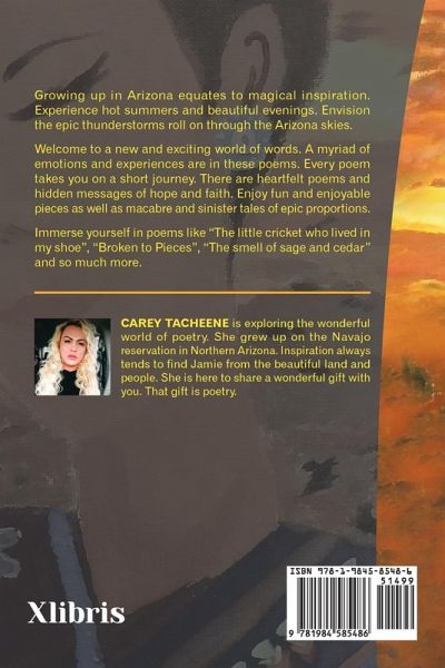 Growing up in Arizona equates to magical inspiration. Experience hot summers and beautiful evenings. Envision the epic thunderstorms roll on through the Arizona skies. Welcome to a new and exciting world of words. A myriad of emotions and experiences are in these poems. Every poem takes you on a short journey. There are heartfelt poems and hidden messages of hope and faith. Enjoy fun and enjoyable pieces as well as macabre and sinister tales of epic proportions. Immerse yourself in poems like "The little cricket who lived in my shoe", "Broken to Pieces", "The smell of sage and cedar" and so much more.