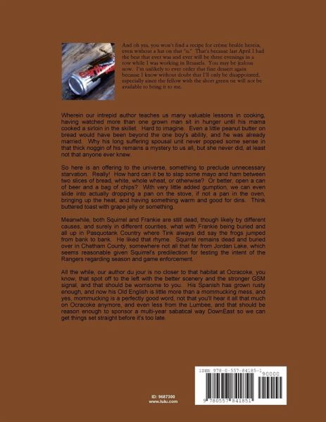 Wherein our intrepid author teaches us many valuable lessons in cooking, having watched more than one grown man sit in hunger until his mama cooked a sirloin in the skillet. Hard to imagine. Even a little peanut butter on bread would have been beyond the one boy's ability, and he was already married. Why his long suffering spousal unit never popped some sense in that thick noggin of his remains a mystery to us all, but she never did, at least not that anyone ever knew. So here is an offering to the universe, something to preclude unnecessary starvation. Really! How hard can it be to slap some mayo and ham between two slices of bread, white, whole wheat, or otherwise? Or better, open a can of beer and a bag of chips? With very little added gumption, we can even slide into actually dropping a pan on the stove, if not a pan in the oven, bringing up the heat, and having something warm and good for dins. Think buttered toast with grape jelly or something.