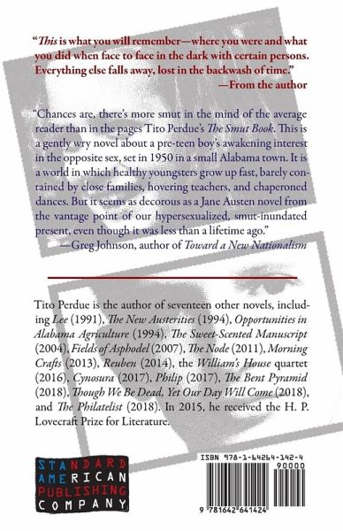 "This is what you will remember-where you were and what you did when face to face in the dark with certain persons. Everything else falls away, lost in the backwash of time."-From the author "Chances are, there's more smut in the mind of the average reader than in the pages Tito Perdue's The Smut Book. This is a gently wry novel about a pre-teen boy's awakening interest in the opposite sex, set in 1950 in a small Alabama town. It is a world in which healthy youngsters grow up fast, barely contained by close families, hovering teachers, and chaperoned dances. But it seems as decorous as a Jane Austen novel from the vantage point of our hypersexualized, smut-inundated present, even though it was less than a lifetime ago." -Greg Johnson, author of Toward a New Nationalism