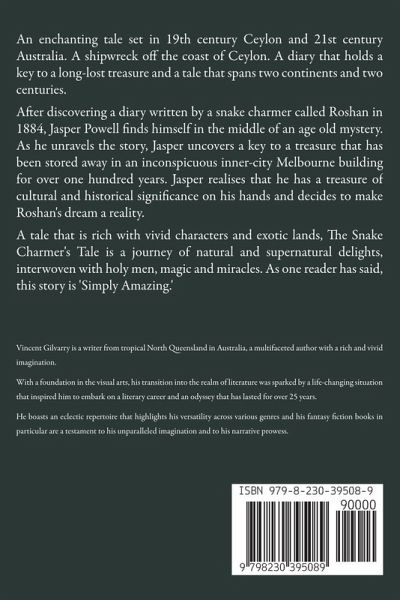 An enchanting tale set in 19th century Ceylon and 21st century Australia. A shipwreck off the coast of Ceylon. A diary that holds a key to a long-lost treasure and a tale that spans two continents and two centuries. After discovering a diary written by a snake charmer called Roshan in 1884, Jasper Powell finds himself in the middle of an age old mystery. As he unravels the story, Jasper uncovers a key to a treasure that has been stored away in an inconspicuous inner-city Melbourne building for over one hundred years. Jasper realises that he has a treasure of cultural and historical significance on his hands and decides to make Roshan's dream a reality. A tale that is rich with vivid characters and exotic lands, The Snake Charmer's Tale is a journey of natural and supernatural delights, interwoven with holy men, magic and miracles. As one reader has said, this story is 'Simply Amazing.'