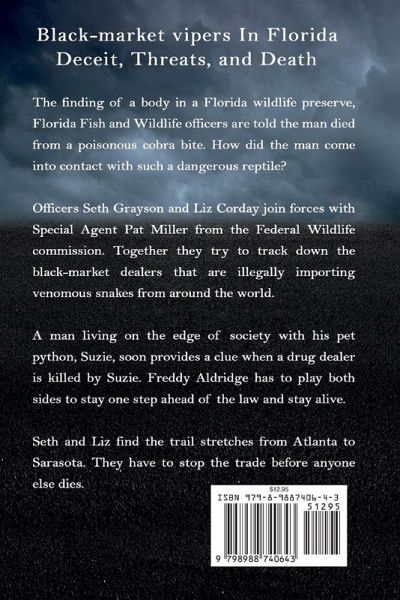 Inspired by true events. The finding of a body in a Florida wildlife preserve, Florida Fish and Wildlife officers are told the man died from a poisonous cobra bite. How did the man come into contact with such a dangerous reptile? Officers Seth Grayson and Liz Corday join forces with Special Agent Pat Miller from the Federal Wildlife commission. Together they try to track down the black-market dealers that are illegally importing venomous snakes from around the world. A man living on the edge of society with his pet python, Suzie, soon provides a clue when a drug dealer is killed by Suzie. Freddy Aldridge has to play both sides to stay one step ahead of the law and stay alive. Seth and Liz find the trail stretches from Atlanta to Sarasota. They have to stop the trade before anyone else dies.