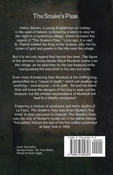 Arthur Severn, a young Englishman on holiday in the west of Ireland, is forced by a storm to stop for the night in a mysterious village, where he hears the legend of "The Snake's Pass." Long ago, it is said, St. Patrick battled the King of the Snakes, who hid his crown of gold and jewels in the hills near the village. But it is not only legend that haunts the town. The figure of the demonic money-lender Black Murdock looms over the village, as he searches for the lost treasure while manipulating the townsfolk to his own evil ends. Even more threatening than Murdock is the shifting bog, personified as a baneful "carpet of death," which will swallow up anything -- and anyone -- in its path. Art and his friend Dick will brave the dangers of the bog to seek out the treasure, but the sinister machinations of Murdock will lead to a deadly conclusion! Featuring a slow accumulation of terror worthy of Le Fanu, The Snake's Pass was Bram Stoker's first novel. A clear precursor to Dracula, The Snake's Pass was the only of Stoker's novels set in his native Ireland. This edition follows the text of the first edition published at New York in 1890.