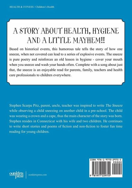 Like an infections rocket, a human sneeze can propel germs at over 100 mph. Imagine being blanketed by germs! What can happen? What will happen? That remains to be seen. Yet the simple act of covering your mouth when you sneeze and washing your hands often can prevent colds and flu from infecting us. The Sneeze is a story of how a king of a fairy tale kingdom sneezes and does not cover his mouth. A king germ escapes, multiplies and infects the entire kingdom. Doctors and nurses rush to defend the sick. The kingdom recovers and the king learns his lesson. This may be art depicting life but written as a poem for children and complete with a song and colorful illustrations. The Sneeze is an enjoyable and fun read for parents, family and teachers to convey this simple yet important message to children.