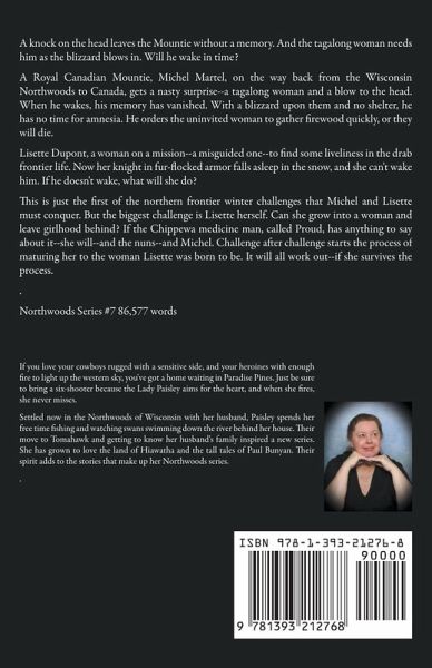 A knock on the head leaves the Mountie without a memory. And the tagalong woman needs him as the blizzard blows in. Will he wake in time? A Royal Canadian Mountie, Michel Martel, on the way back from the Wisconsin Northwoods to Canada, gets a nasty surprise--a tagalong woman and a blow to the head. When he wakes, his memory has vanished. With a blizzard upon them and no shelter, he has no time for amnesia. He orders the uninvited woman to gather firewood quickly, or they will die. Lisette Dupont, a woman on a mission--a misguided one--to find some liveliness in the drab frontier life. Now her knight in fur-flocked armor falls asleep in the snow, and she can't wake him. If he doesn't wake, what will she do? This is just the first of the northern frontier winter challenges that Michel and Lisette must conquer. But the biggest challenge is Lisette herself. Can she grow into a woman and leave girlhood behind? If the Chippewa medicine man, called Proud, has anything to say about it--she will--and the nuns--and Michel. Challenge after challenge starts the process of maturing her to the woman Lisette was born to be. It will all work out--if she survives the process. . Northwoods Series #7 86,577 words