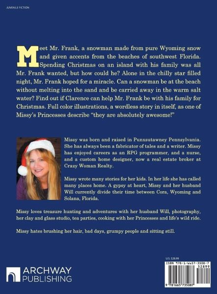 Meet Mr. Frank, a snowman made from pure Wyoming snow and given accents from the beaches of southwest Florida. Spending Christmas on an island with his family was all Mr. Frank wanted, but how could he? Alone in the chilly star filled night, Mr. Frank hoped for a miracle. Can a snowman be at the beach without melting into the sand and be carried away in the warm salt water? Find out if Clarence can help Mr. Frank be with his family for Christmas. Full color illustrations, a wordless story in itself, as one of Missy's Princesses describe "they are absolutely awesome!"